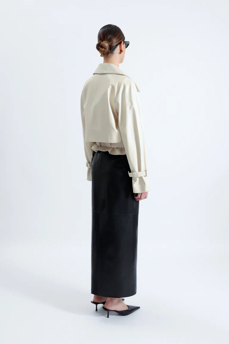 Designed with a notched lapel collar and a sleek front lapel, this jacket exudes refined sophistication. Accentuated with wrist belts and a waist belt, both featuring leather-covered buckles, it delivers a structured yet loose silhouette perfect for layering. With a length of 51.5 cm (20.28 inches), this piece adds just the right edge to casual or semi-formal wear.