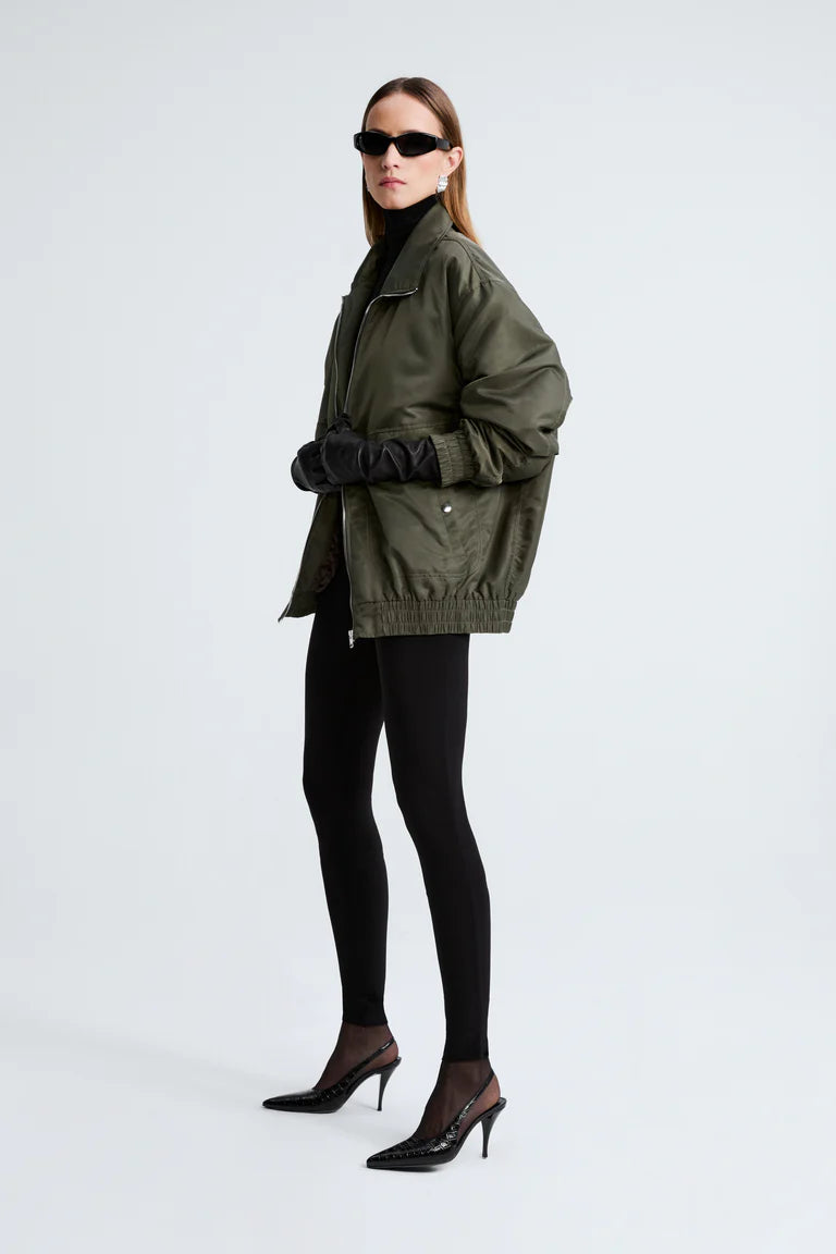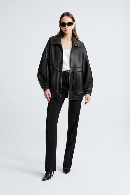 Featuring a stand collar, two functional side pockets, a smooth zipper closure, and elastic waist and wrists, this jacket delivers a snug yet relaxed silhouette that flatters all body types. Its oversized fit brings a modern, laid-back vibe, ideal for transitional weather or layering on cooler days.