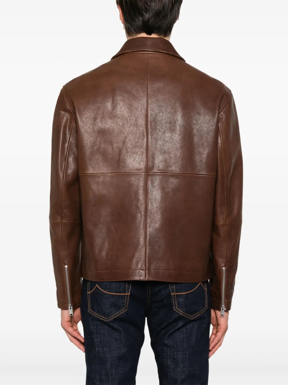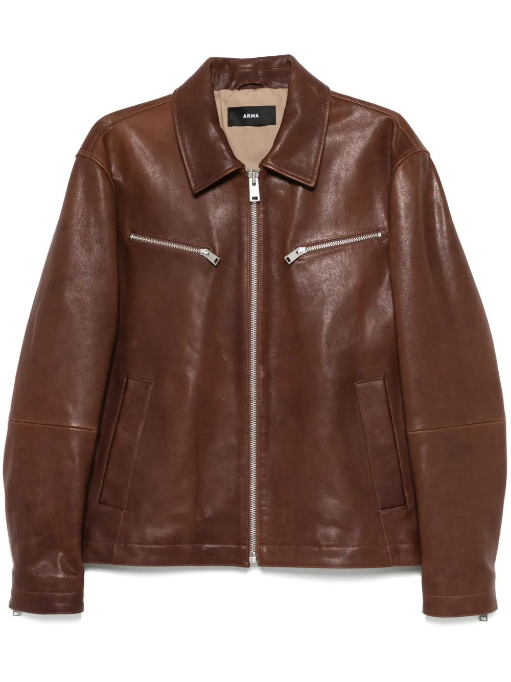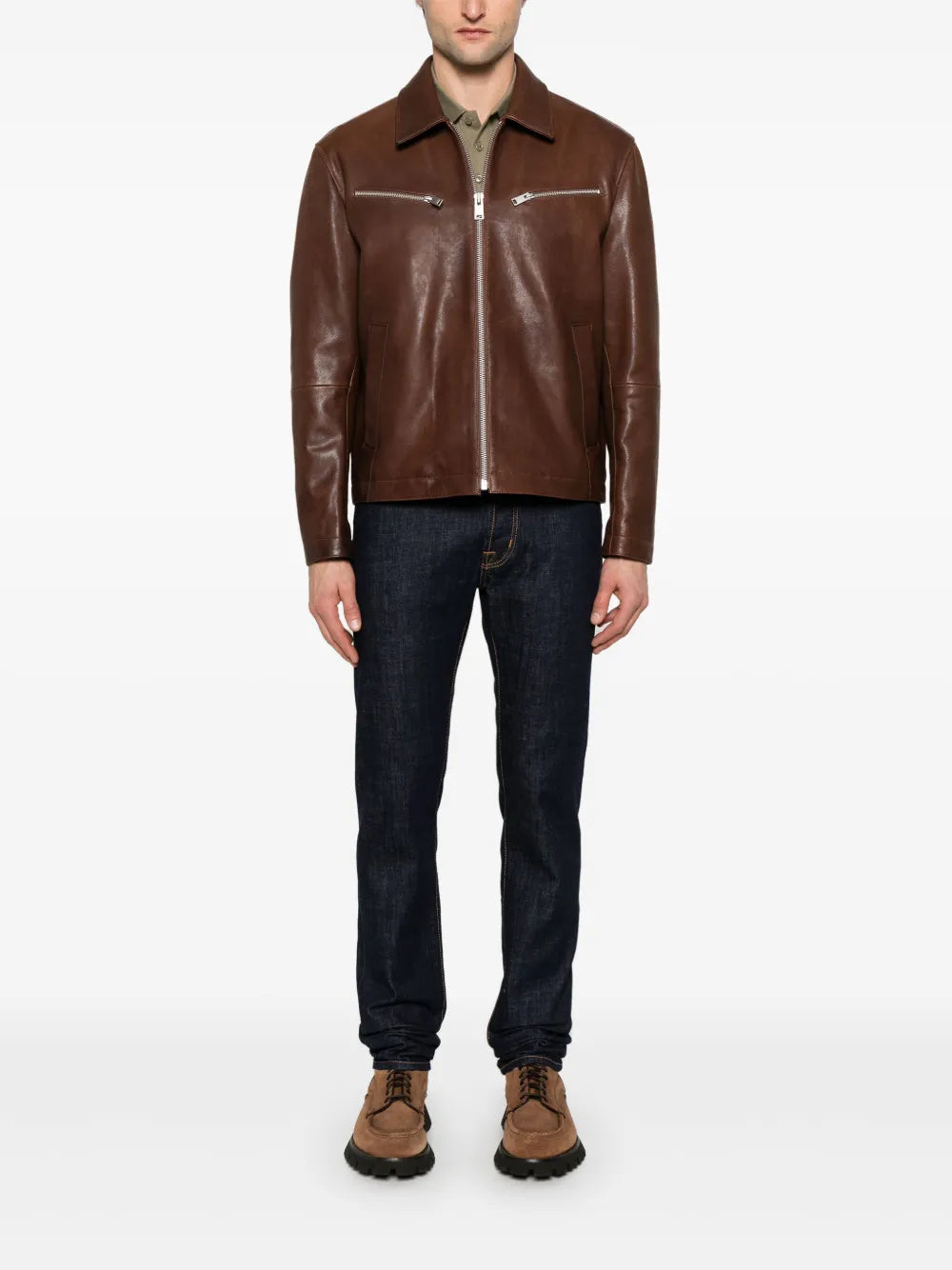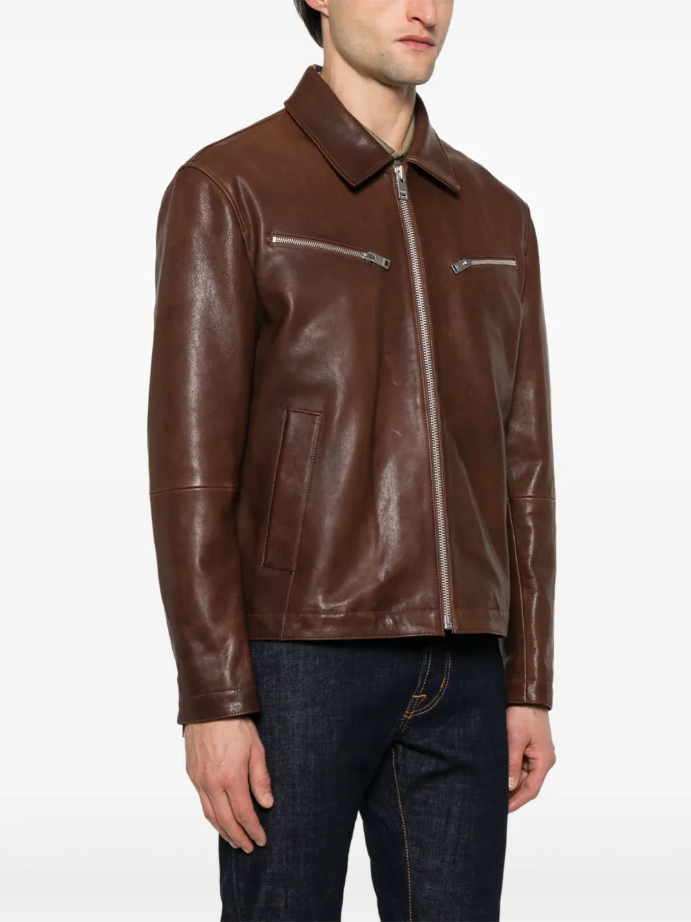 Crafted from premium leather in a rich chocolate brown tone, this jacket features a sleek front zip fastening for effortless wear. Two zip-fastening chest pockets and two side welt pockets add both functionality and an urban edge, while the long sleeves provide a comfortable fit for daily wear. The versatile design makes it perfect for layering over casual or semi-formal outfits, giving your wardrobe a timeless yet contemporary piece.